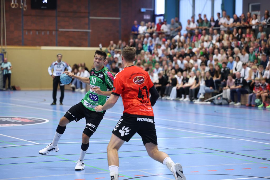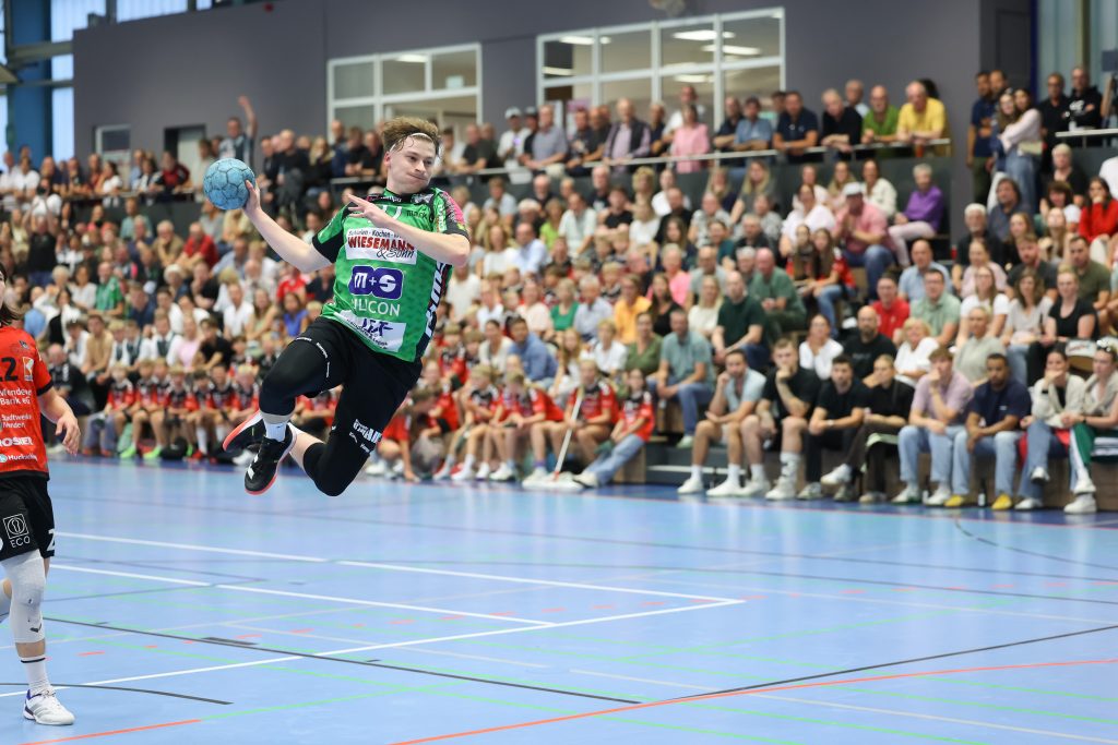 Die Überraschung ist ausgeblieben, der Favorit hat das mit Spannung erwartete Derby gewonnen. Die Mendener hatten am Ende verdientermaßen die Nase vorn, aber unser HTV beiwes, dass er in dieser Liga mithalten kann. Der Auftritt der Mannschaft von Bosko Bjelanovic in der rappelvollen Walramhalle hat auf jeden Fall Appetit gemacht auf Regionalliga-Handball. Zur prächtigen Stimmung trugen auch die zahlreichen HTV-Fans bei, die nach 50 Sekunden Moritz Eigenbrodts Treffer bejubeln konnten. Er warf das erste Regionalligator des HTV.