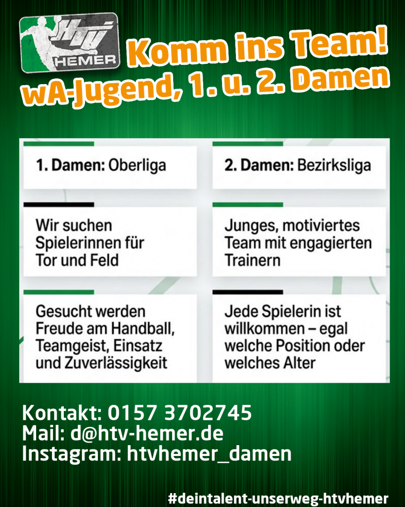 Vor allem auf der Torhüterposition suchen wir weiterhin Verstärkung. Aber auch ambitionierte Feldspielerinnen, die sich sportlich weiterentwickeln und in einem leistungsorientierten Umfeld trainieren möchten, sind beim HTV Hemer jederzeit willkommen. Wer Lust auf ein starkes Umfeld, klare Perspektiven und echten Teamgeist hat, sollte sich jetzt melden. Selbst ein Einsatz im Qualifikationsturnier der weiblichen A-Jugend ist noch möglich.