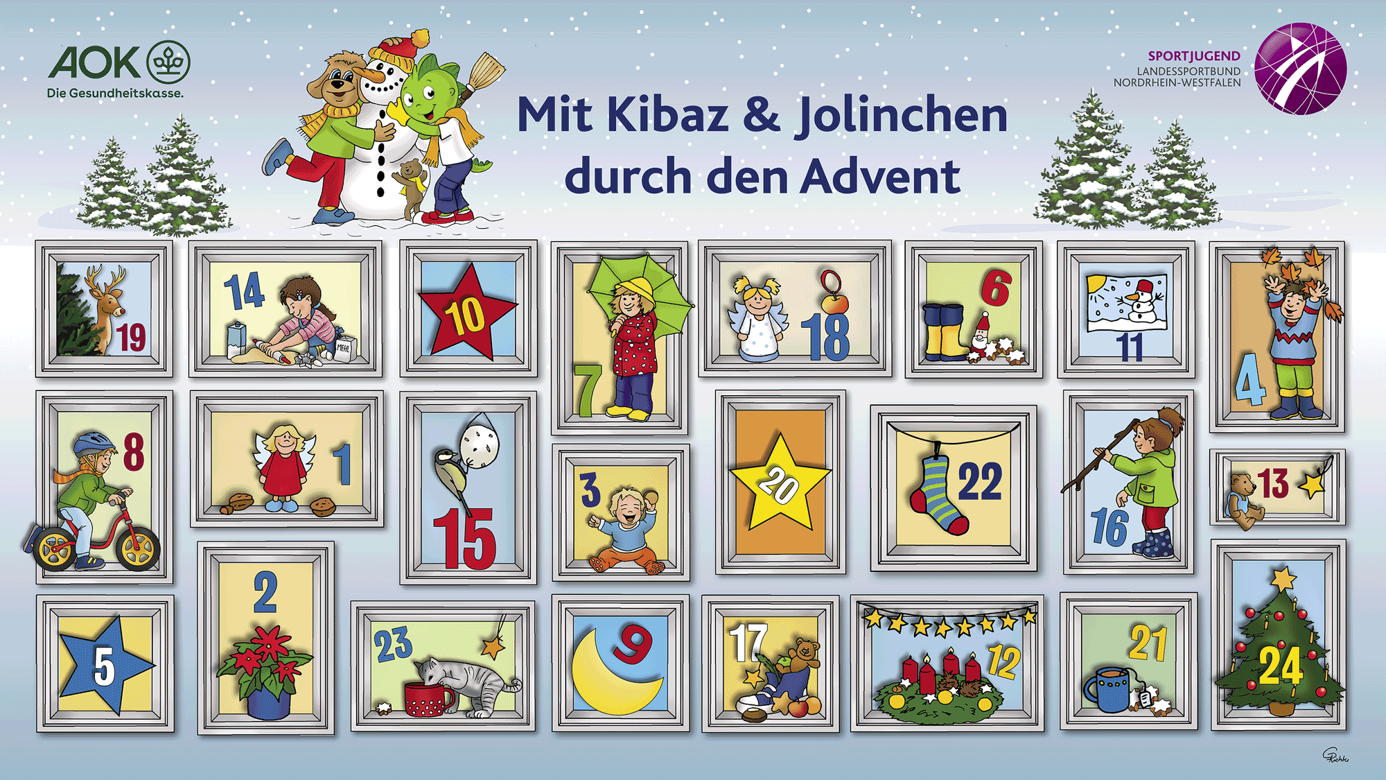 Der Adventskalender richtet sich vorrangig an Familien mit Kindern im Kindergartenalter. Mitmachen lohnt sich: Wer seine pfiffigen Ideen oder Fotos einsendet, erhält von der AOK und der Sportjugend NRW kleine Überraschungen. Ein Klick liefert jeden Tag eine neue Idee, um gemeinsam als Familie zu spielen, sich zu bewegen oder zu basteln: Am 1. Dezember öffnet sich wieder der digitale Adventskalender „Mit Kibaz und Jolinchen durch den Advent“, den die Sportjugend NRW – zusammen mit der AOK Rheinland/Hamburg und der AOK NordWest – wie im Vorjahr freischaltet.
