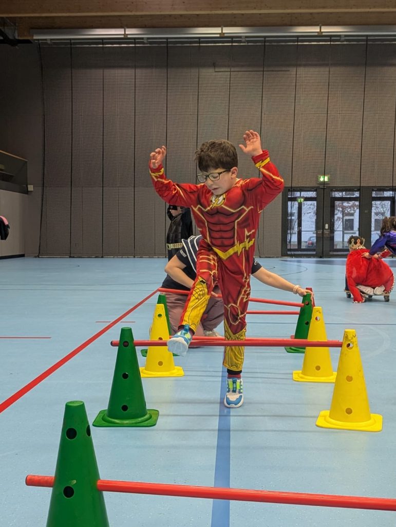 Nach dem tänzerischen Aufwärmprogramm konnten sich alle “Frösche” frei in der Halle bewegen und den aufgebauten Parcours für sich entdecken. Zahlreiche Stationen standen zur Auswahl und luden zu intensiven Aktivitäten ein – ob Werfen, Klettern, Sprünge von einer hohen Kiste, Balancieren, Prellen oder das Überspringen von Hindernissen und das anschließende “Drunterherkriechen”: Für Abwechslung war in dieser besonderen Trainingseinheit gesorgt. Natürlich durften sich die Lucky Frogs auch selbst etwas wünschen, und ganz schnell wurden die beliebten Rollbretter entdeckt. So konnten die “Frösche” bei stimmungsvoller Karnevalsmusik das machen, woran sie den meisten Spaß hatten.
