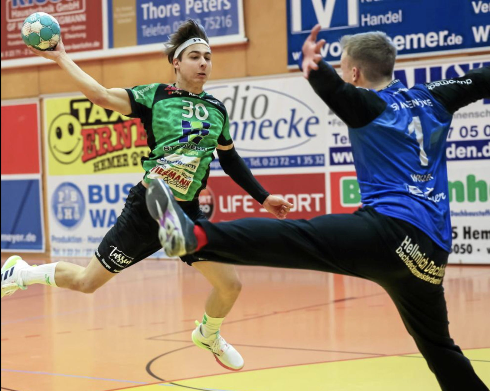 Für das erste echte Highlight der Partie sorgte in der 16. Minute Hemers Wael Ben Youssef, der eine perfekte Vorarbeit von Elias Lübbering per Kempa-Trick zur 9:7-Führung des HTV verwandelte. Doch die Gäste kamen prompt zurück und hatten sich durch drei Treffer in Folge nur drei Minuten später ihrerseits die Führung zurückerobert. Ein Auszeit von Bosko Bjelanovic stoppte zwar Altenbögges Lauf, aber bis zur Pause blieb es eine Partie auf Augenhöhe.